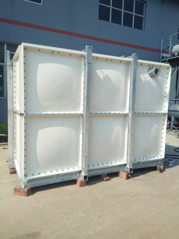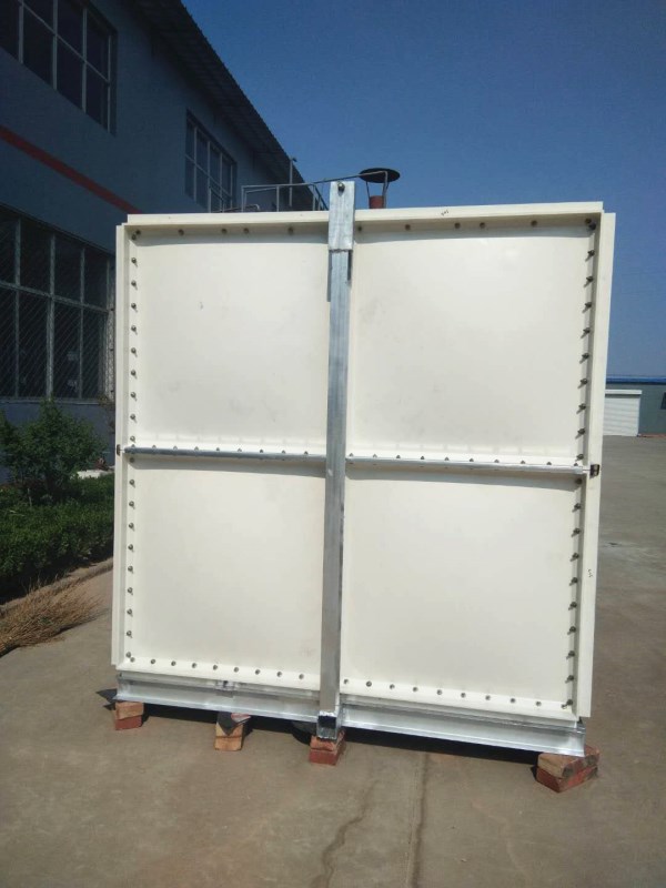 無內件外加固玻璃鋼水箱設計內加強結構型式,水箱箱體為型板裝配氬弧焊接而成,型板拼裝交叉部位設計雙向加強聯桿。箱體側板與底板間設置垂直加固柱,水箱側板四周外每層相鄰。型板間設置水平加強板,加強材料同箱體材料。水箱底部設置鍍鋅槽鋼支架。水箱附件有檢查孔、內外扶梯、工藝管口、材料均為不銹鋼,水箱工藝管口按用戶提供的圖樣設計。