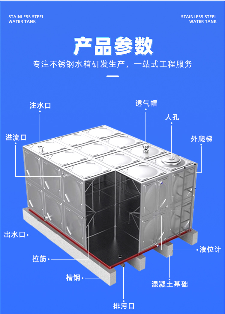 方形水箱設有檢修孔、進水口、出水口、排污口、排氣口、溢流口,有時根據客戶水箱的功能而增減水口。排污口是排放水箱內污垢的,可直接接排污閥門就地排污,可現場根據實際情況安裝。溢水口是水箱排氣和浮球閥失靈時溢水之用,可接在排污,亦可讓其就地排水,但切忌不能裝閥門。浮球閥應經常檢查,及時維修。